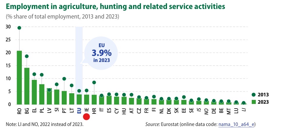 I’m not sure today’s Eurostat figures on the value add of agriculture to the Irish economy do justice to the importance of the sector to the rural economy, normalised as they are to GDP. I think a more illustrative measure, relatively, is the percentage employment of agriculture which is very close to the EU average, albeit declining over the last decade. Original article at https://ec.europa.eu/eurostat/web/products-eurostat-news/w/ddn-20260223-1