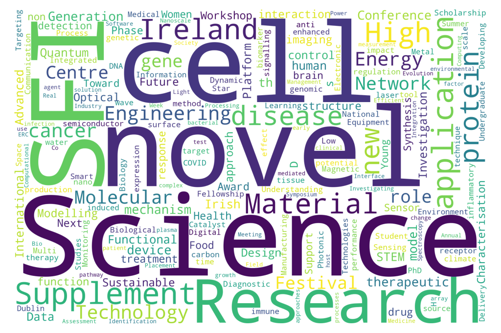 Now that Science Foundation Ireland has become Research Ireland, I came across their updated open data at https://data.gov.ie/ on all the awards they made – over 7200 of them from 2001 to 2025. There are insights here into the evolution of third level research in Ireland and activity around supporting large scale multi-party collaborations and individual commercialisation of promising findings. Latterly, an increasing focus on solving grand challenges is apparent. Too much to distill yet so a quick word cloud of the project titles for now below.