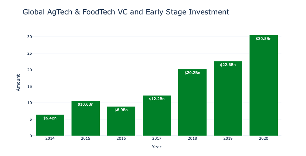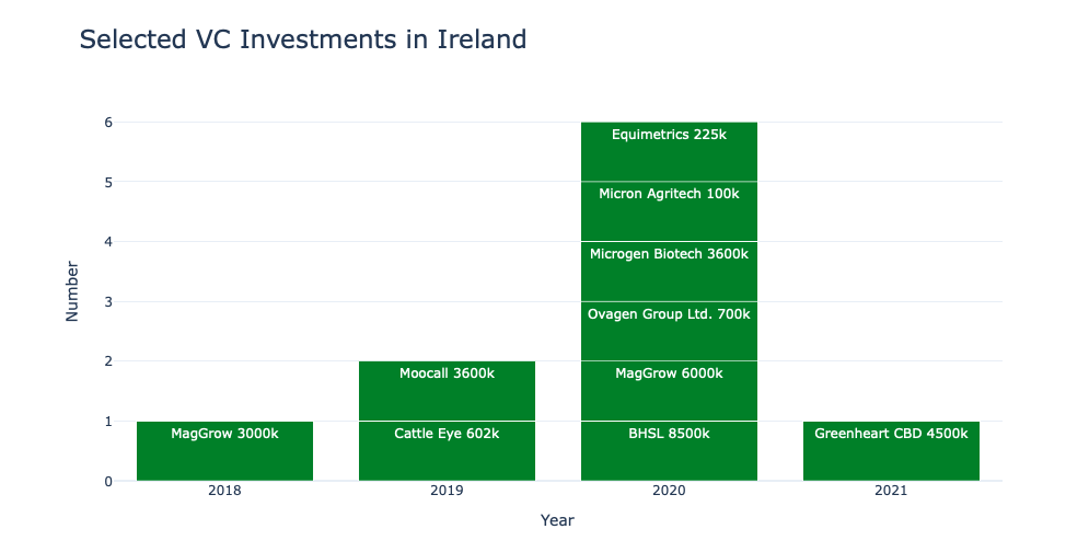 There are local VC funds such as Yield Lab and Finistere that specialise in funding startups in the AgTech and FoodTech spaces. They often co-fund in a syndicate of other private and VC investors. Looking at recent investment data in Ireland from TechIreland, there were investments in 14 AgTech companies in 2020, unchanged from the previous year. However, in contrast to 2019’s €30M invested in the sector, some €38M was invested in 2020. Where the data has been made available, the startups are active in AgriBiotech (eg. Micron Biotech) and automated animal monitoring (eg. Moocall, Cattle Eye, etc) and food products (Greenhart CBD). Considering that the specialist funds are early in their investment cycle and the growing interest being shown by privates and other funders in the space, it looks like it has room to grow.
